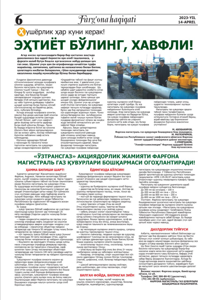"Farg‘ona haqiqati" gazetasida "Hushyorlik har kuni kerak!" rukni ostida magistral gaz quvurlarining muhofaza maydonlariga oid, hamma bilishi shart bo‘lgan qoidalar haqida maqolalar chop etildi.